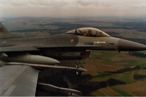 On September 22, 1990, Brahma Flight, a flight of four F-16s from the 10th Tactical Fighter Squadron (TFS), launched from Hahn Air Base, Germany on a simulated bombing mission aimed at a “target” south of Stuttgart. KC Schow was flight lead for the four-ship, with Ed “Julio” Houle, Dave “McGoo” Sandlin, and JD Williams flying as his wingmen. Julio, the 10th TFS squadron commander, was giving KC his initial flight instructor check ride. I was strapped into the back seat of Julio’s jet, riding along for the mission.
